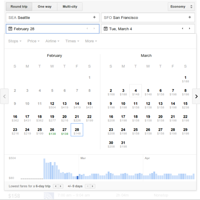 Look below the calendar to see our Lowest fares tool, which lets you see which dates will give you low prices on flights. Change the trip length or see if traveling different dates will nab you a better price. You can also add in any flexibility you might have on trip duration by changing the +/- flexibility option.